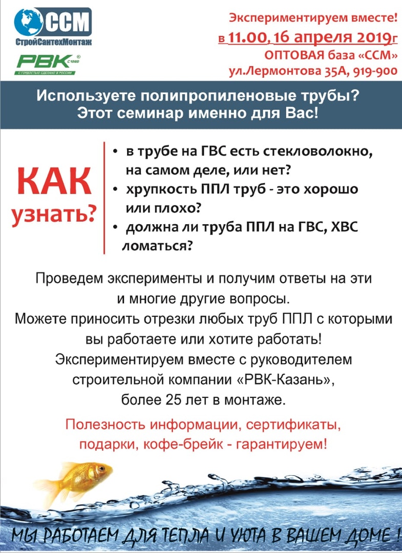 Успей зарегестрироваться! 26 апреля 2019 года в 11:00, пройдет семинар "РВК". Вместе с профессионалами в полипропилене мы будем ставить эксперементы над трубами ппл. Присоединяйтесь! Телефон для регистрации на семианр: 8(8552) 919-900. |